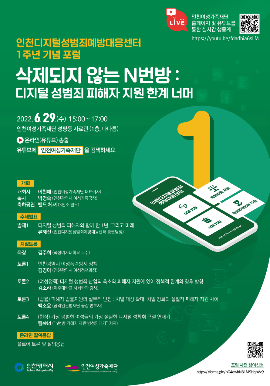 [인천광역시여성가족재단]인천디지털성범죄예방대응센터 1주년 기념 포럼 : 삭제되지 않는 N번방