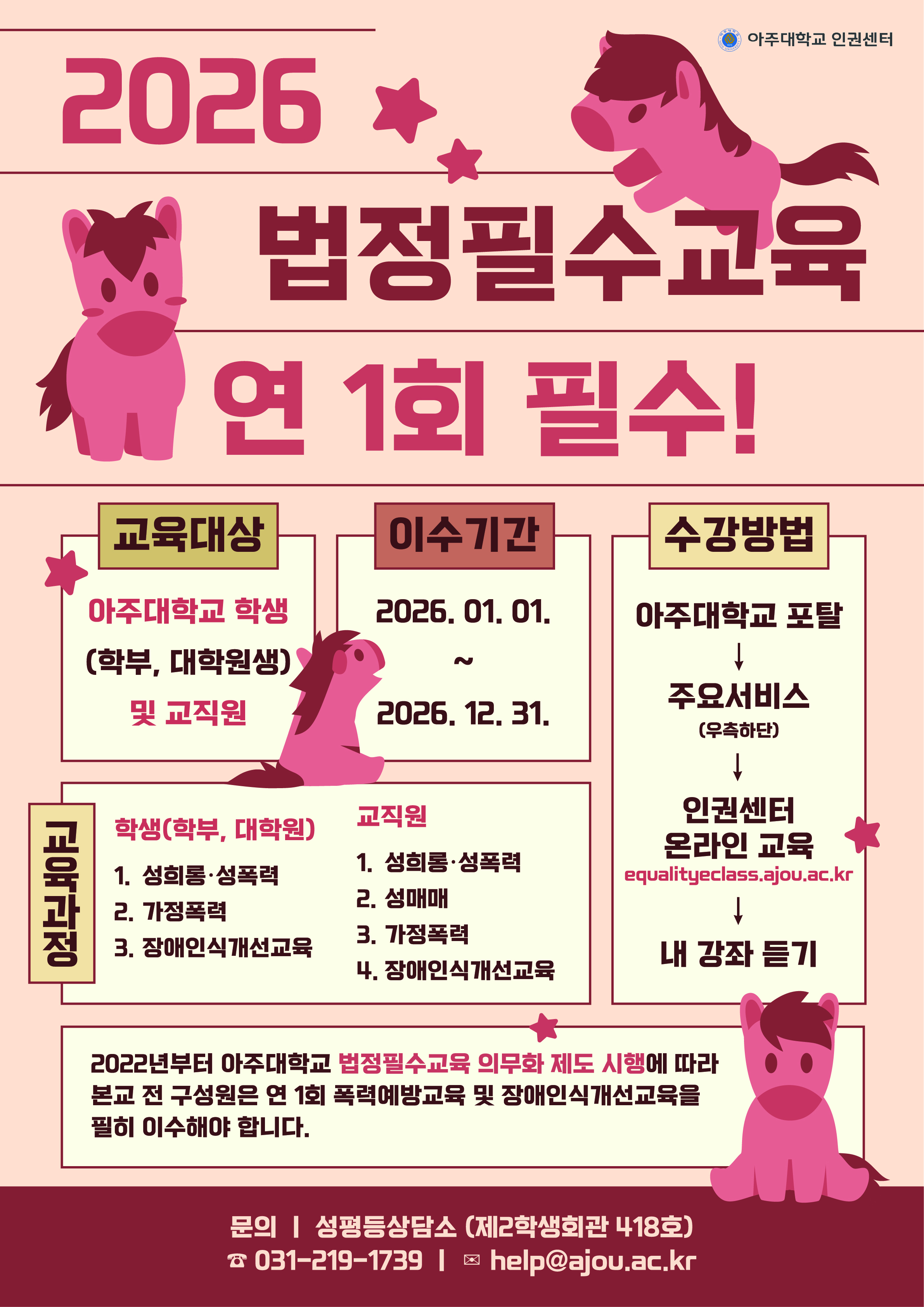 [공지] [인권센터 성평등상담소] 아주대학교 구성원이라면 ⭐연 1회 필수⭐ 법정필수교육 수강 안내
