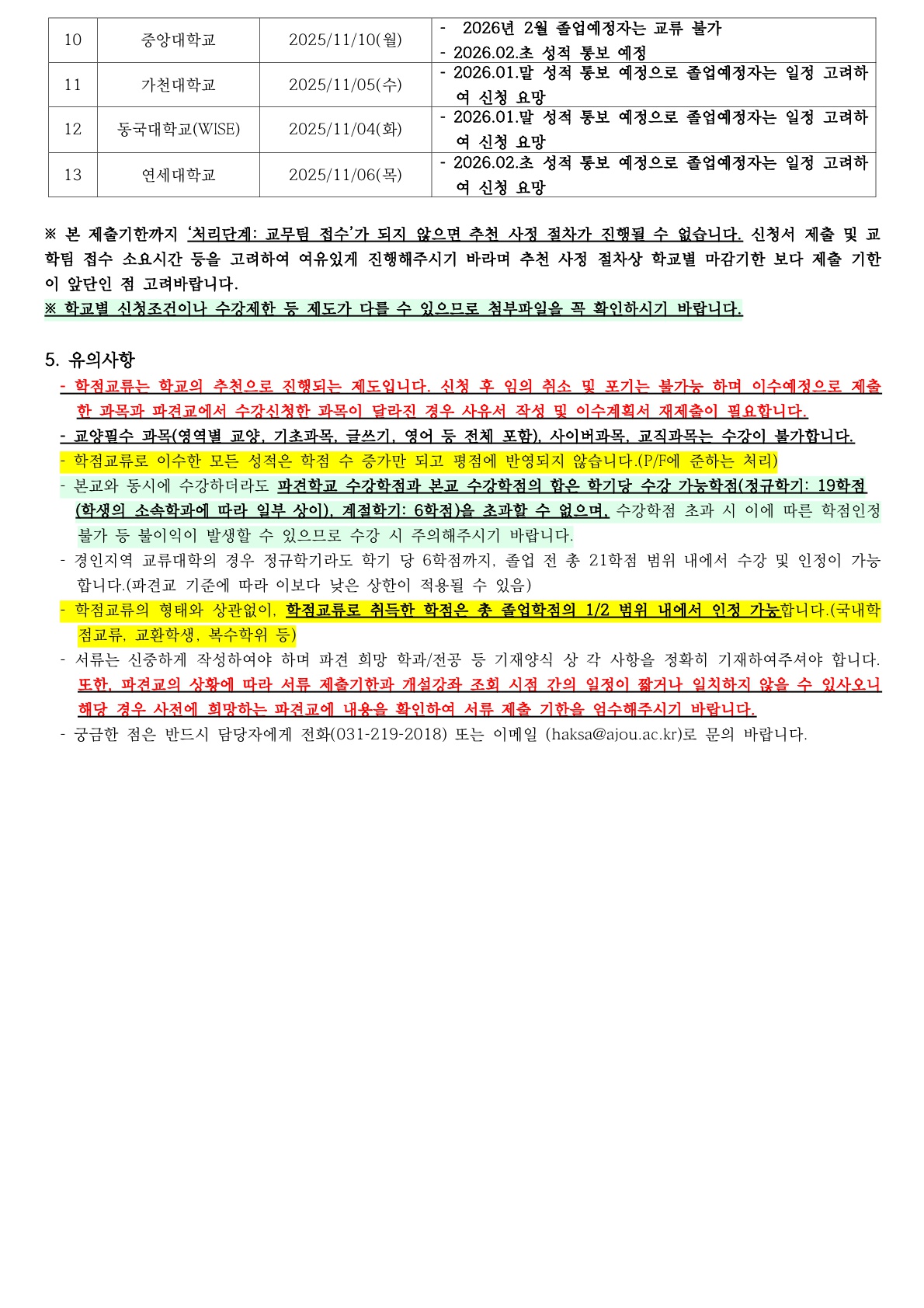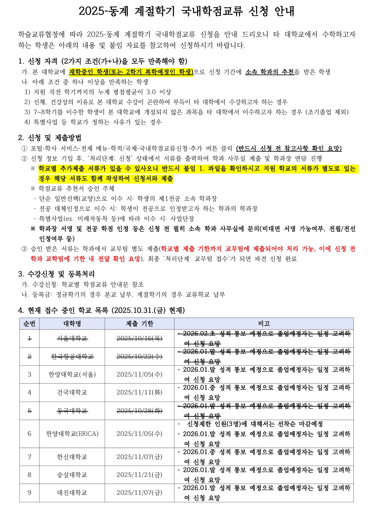 [학사] [학부/학사과정] (25.10.31.) 2025-동계 계절학기 국내대학 학점교류 신청 안내